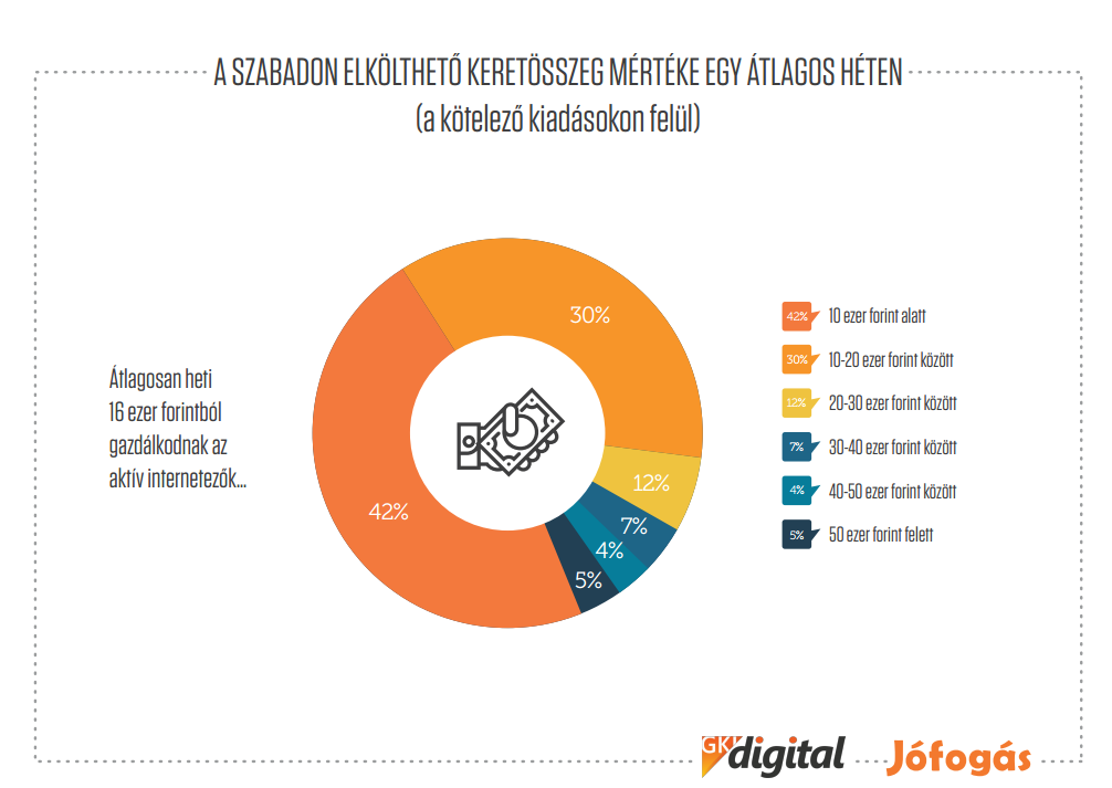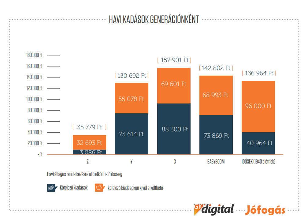 Havi maximum nettó 120 ezer forintos fizetés 10 ezer forintos heti költekezést tesz lehetővé – derült ki a válaszadók pénzköltési szokásait vizsgálva. A Z generáció túlnyomó többsége havonta alig több mint 30 ezer forintból gazdálkodik, de az Y-ok sem haladják meg a havi átlagos 55 ezret, a kötelező kiadások után maradó keretet tekintve.