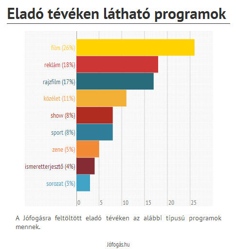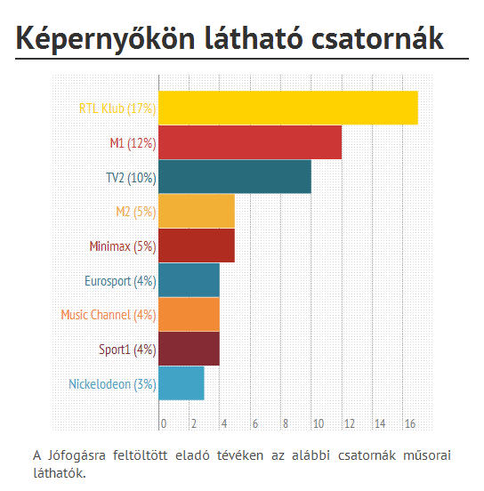 Gondoltak egy nagyot a portálnál, rákerestek a tévé kategóriára és sorba vették a lefényképezett tévéket. Csipketerítővel letakart öreg masina, vagy hipermodern plazma, az apróhirdetési oldal munkatársai nem a készülékekre figyeltek, hanem arra, hogy milyen műsor ment éppen a fotózás pillanatában! A felhasználók 27%-ának képernyőjén a két nagy kereskedelmi adó egyikének műsora futott, 18% pedig a közszolgálati csatornákat követte figyelemmel. Hihetetlenül népszerűek a rajzfilmeket kínáló csatornák: a „nagy” országos adók után a hatodik helyen a Minimax áll a maga 5%-ával, de a többi, kizárólag rajzfilmeket kínáló kábeltévé is remekül teljesített. A mulatós zene a virágkorát éli Magyarországon, ezt jól bizonyítja, hogy a Muzsika TV és a Nóta TV a legtöbb sport és közéleti csatornát leverve együtt 5%-ot szerzett. A Házibuli Attilával többször is visszaköszönt a képernyőkről! Arra, hogy tévéeladási akció közben hányan fogyasztottak felnőtt tartalmakat, nem tért ki a vizsgálat, hiszen az ilyen jellegű képek nem kerülhetnek fel az e-kereskedelmi portálra.