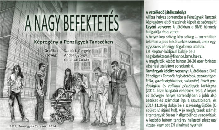 A nagy befektetés címmel folyó képregény kirakó játék zárul hamarosan a Műegyetemen. A játékban a hallgatóknak egy képregény összekevert képeit kellett helyes sorrendbe rakni, majd a képeken lévő számokból összeállt egy kód, amit megfejtve egy pénzügyi fogalmat kellett kitalálniuk.