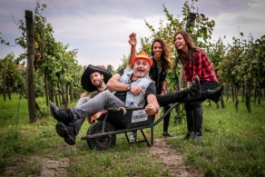 Eluralkodott az eklektika a szőlőtőkék között. Varga Viktor, Sipos Tomi, Marenec Fruzsi és Tücsi rendhagyó szüretet tartott, és a bornak való helyett, a finnek kedvenc vodkájának ízeit szimbolizáló gyümölcsöket gyűjtötte szauna vödrökbe. A fiúk a zsonglőrködéssel is megpróbálkoztak, majd Viktor magára vállalva a minőségellenőr szerepét, a SportKlub csinos műsorvezetőjének, Tücsinek kezéből kóstolta meg az áfonyát. A megfékezhetetlen társaság ezután talicskába pattant, és egy őrült futamba kezdett, amelynek rövidúton borulás lett a vége. A hangulat ettől olyannyira felfokozódott, hogy sztárjaink a gólyalábazást is kipróbálták – kisebb-nagyobb sikerrel. A magasból szemlélve a terepet, pedig kiválasztották a legmegfelelőbb helyet saját gyártású madárijesztőik elhelyezésére is.