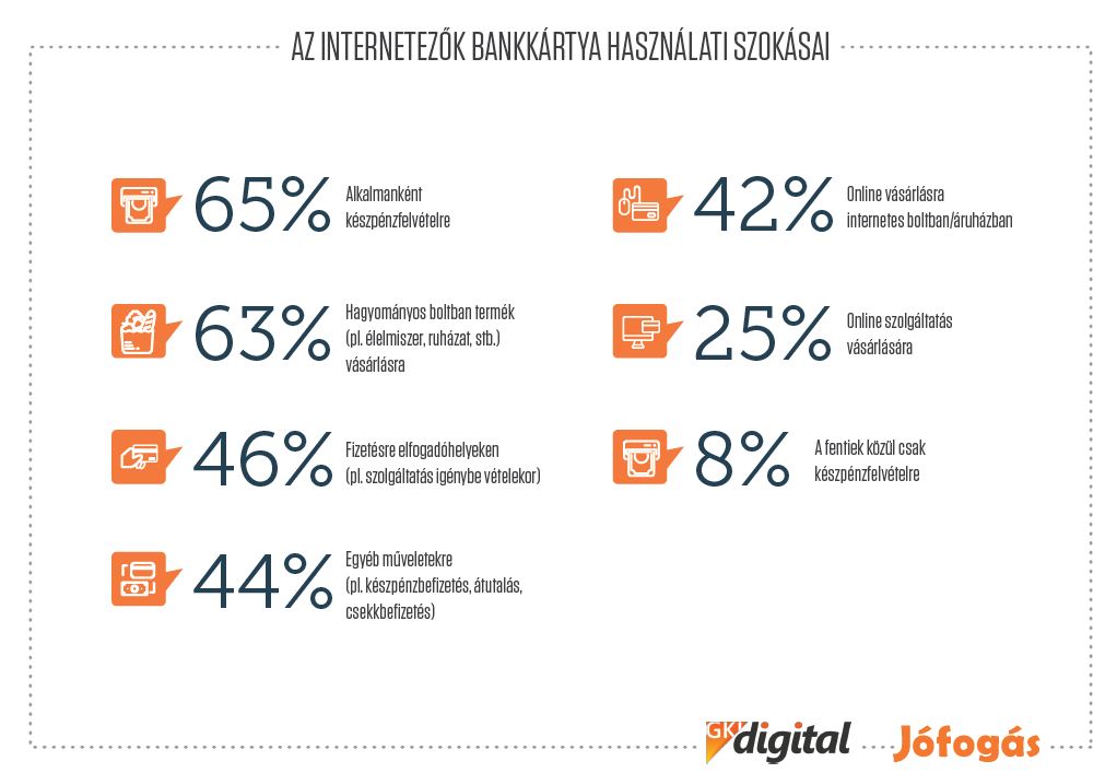 Bár a megkérdezettek 82%-a rendelkezik bankkártyával, negyedük nem ismeri annak felhasználhatóságát, és a legtöbben még ma is csupán készpénz felvételkor és hagyományos boltban való vásárláskor veszik elő azt. Az online vásárlások ilyen módú kiegyenlítése leginkább a legfiatalabb generációt, a Z korcsoportot jellemzik, noha ez a korosztály egyébként 70%-ban még bankkártya nélkül kezeli felmerülő pénzügyeit.