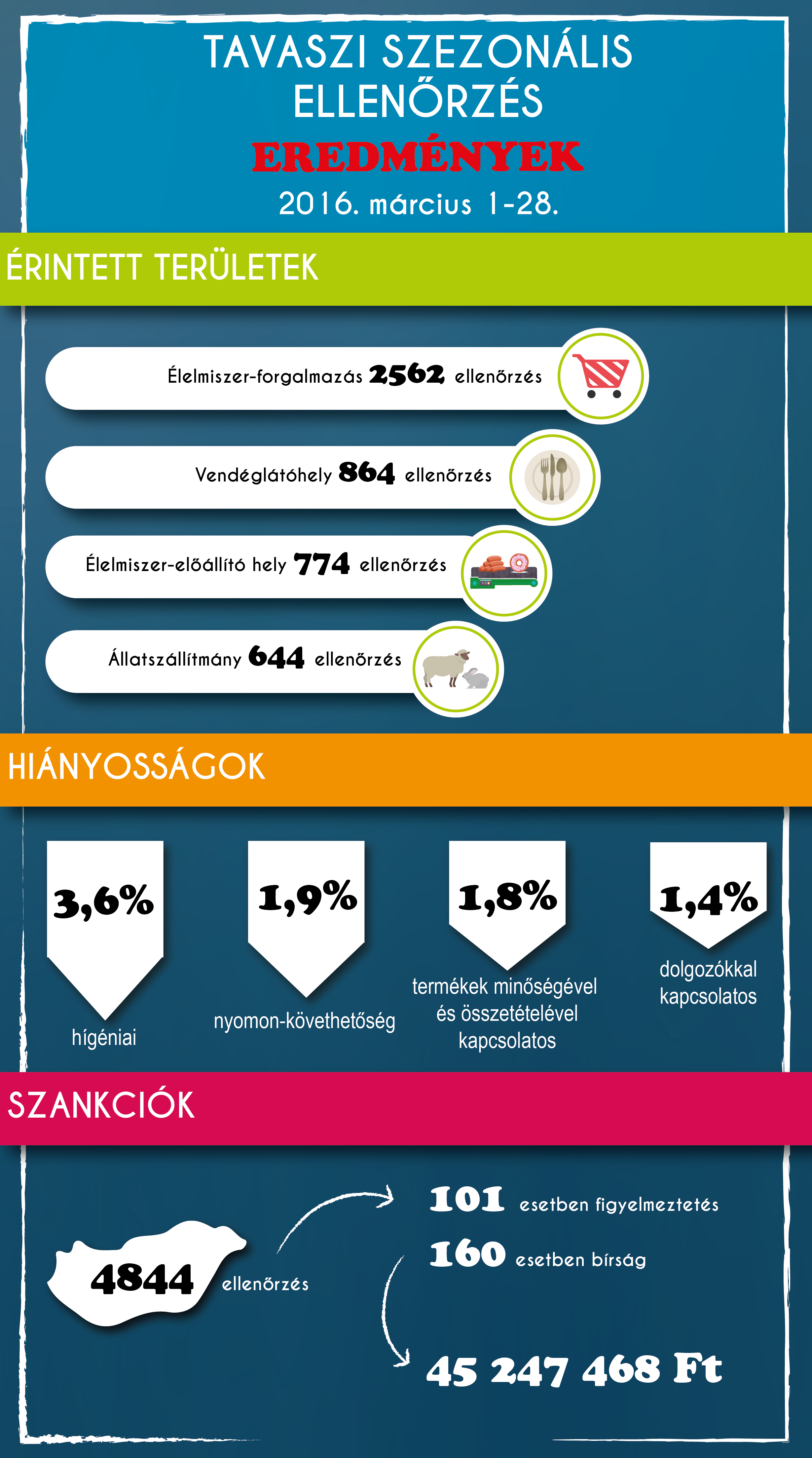 Több mint 4800 ellenőrzés, 200 tonna forgalomból kivont termék és 45 millió forint bírság a 2016-os tavaszi szezonális ellenőrzés fő számai. Az akciósorozat a Nemzeti Élelmiszerlánc-biztonsági Hivatal (NÉBIH) koordinálásával március 1-28. között zajlott országszerte. Bár a higiéniai hiányosságok száma a korábbi évekhez képest némileg emelkedett, azonban jelentősen javult az ellenőrzött termékek minősége.