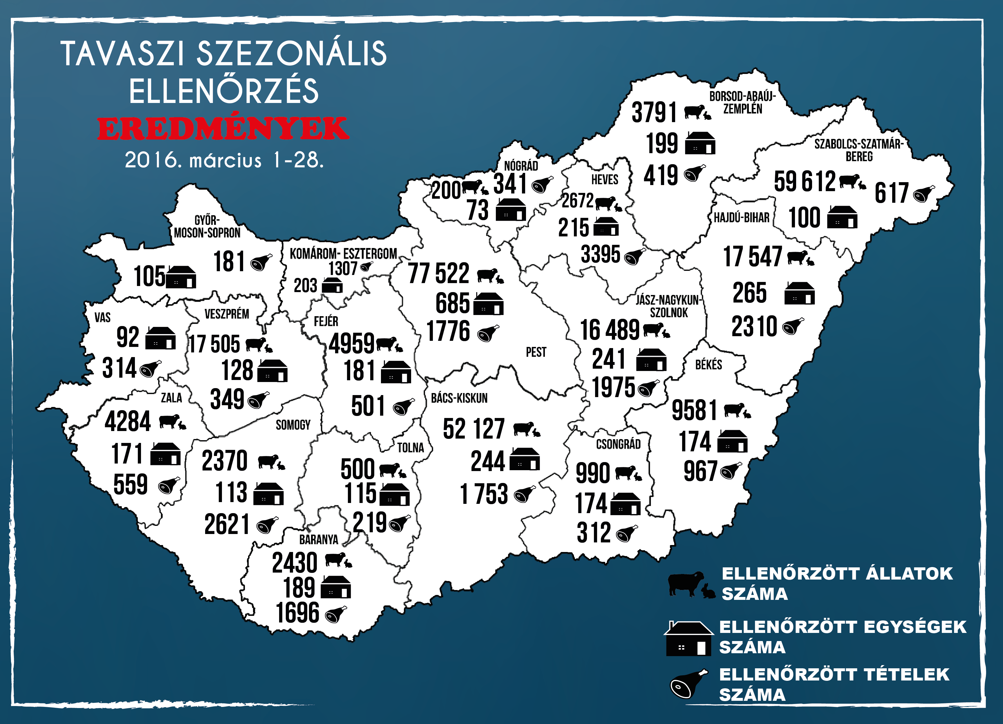 Március 1-28. között összesen 4844 ellenőrzést végeztek az ellenőrök. A feltárt szabálytalanságok miatt 101 alkalommal figyelmeztetést, 160 esetben, összesen 45 247 468 Ft értékben bírságot szabtak ki. A különböző létesítmények ellenőrzése során higiéniai hiányosságokat az összes ellenőrzés 3,6%-ában (2015-ben 2,8%) állapítottak meg az ellenőrök, míg a termékek minőségével és összetételével kapcsolatos szabálytalanságot az esetek 1,8%-ában (2015-ben 3,3%) tapasztaltak. Az ellenőrzések során megvizsgált mintegy 23 000 tétel 2%-át (465 tételt, 200 tonna mennyiségben) kellett kivonni a forgalomból elsősorban a fogyaszthatósági/minőség megőrzési idő lejárta, illetve a jelölési szabályok megsértése és ismeretlen eredet miatt.