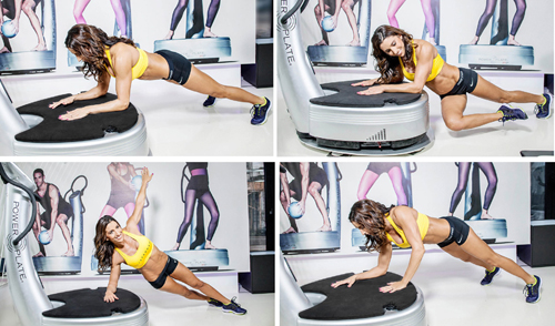 3. Kiinduló helyzet: támaszhelyzet alkartámaszban. Lábak kis terpeszben, has feszes, farizom tónusban. Forduljunk el törzzsel balra úgy, hogy mindkét könyökünk a platón marad, eközben végezzünk jobb térdhúzást az ellenkező oldalra. A gyakorlatot csináljuk meg ellenkező irányba is.