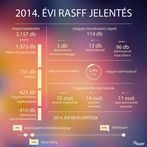 Magyar vonatkozású RASFF ügy 114 volt 2014-ben, amelyből 96 élelmiszerrel, 13 takarmánnyal és 5 élelmiszerrel érintkező anyagokkal foglalkozott. A legtöbb hazai ügy a különleges táplálkozási célú élelmiszerek, étrend-kiegészítők összetételével és szennyezettségével (35 eset) volt kapcsolatos. Egyéb élelmiszerekben patogén mikrobák jelenlétével (14 eset) és ipari szennyezők – például dioxin – jelenlétével (11 eset) volt gyakrabban probléma.