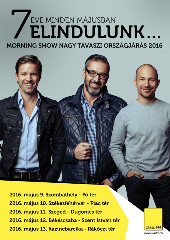 Minden évben óriási izgalommal várják a vidéki városokban élő Class FM hallgatók, hogy vajon hozzájuk érkeznek-e a hazai rádiózás fenegyerekei - a Morning Show sztárjai mindig szédítő jókedvvel, őrületes poénokkal és hatalmas nyereményesővel készülnek arra, hogy felrázzák vidéki közönségük mindennapjait. Tehénfejés élő adásban? Ilyen őrültség is csak Sebestyén Balázséknak juthat az eszébe, akik május 9-én újra Nagy Tavaszi Országjárásra indulnak. Balázs, Jani és Feri idén először Szombathely főterét veszik birtokba, mielőtt Székesfehérvárra, majd Szegedre érkeznének. Látványos üvegstúdiójukkal ezután két új helyszínre gurulnak be, először a békéscsabai Szent István térre látogatnak, majd egy szédületes show után meg sem állnak Kazincbarcikáig.