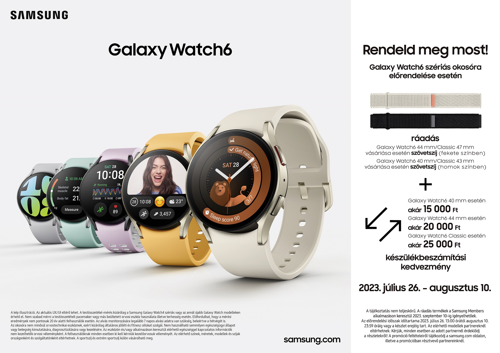 A Galaxy Watch6 és Watch6 okosórák július 26-tól előrendelhetők, a Samsung webáruházában pedig előrendelési promóciókkal készülnek a vásárlóknak. Az új okosórák augusztus 11-től kerülnek a boltokba. A modern és minimalista Galaxy Watch6 tökéletes társ lehet a mindennapokban. A 44 mm-es grafit és ezüst, a 40 mm-es változat pedig grafit és arany színben kapható. A prémium és kialakításában időtlen időmérő eszköz, a Galaxy Watch6 Classic sokak kedvencével, a forgó lünettával rendelkezik, fekete és ezüst színben, 43 és 47 mm-es kivitelben kapható.