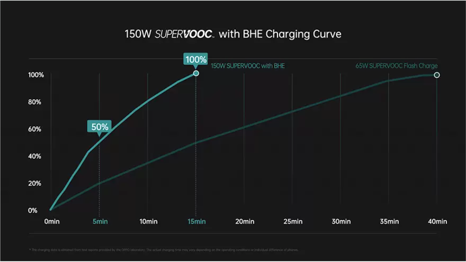 A 150 W-os SUPERVOOC with BHE egy 4500 mAh-s akkumulátort 5 perc alatt 1%-ról 50%-ra, 100%-ra pedig 15 perc alatt tölt fel.1