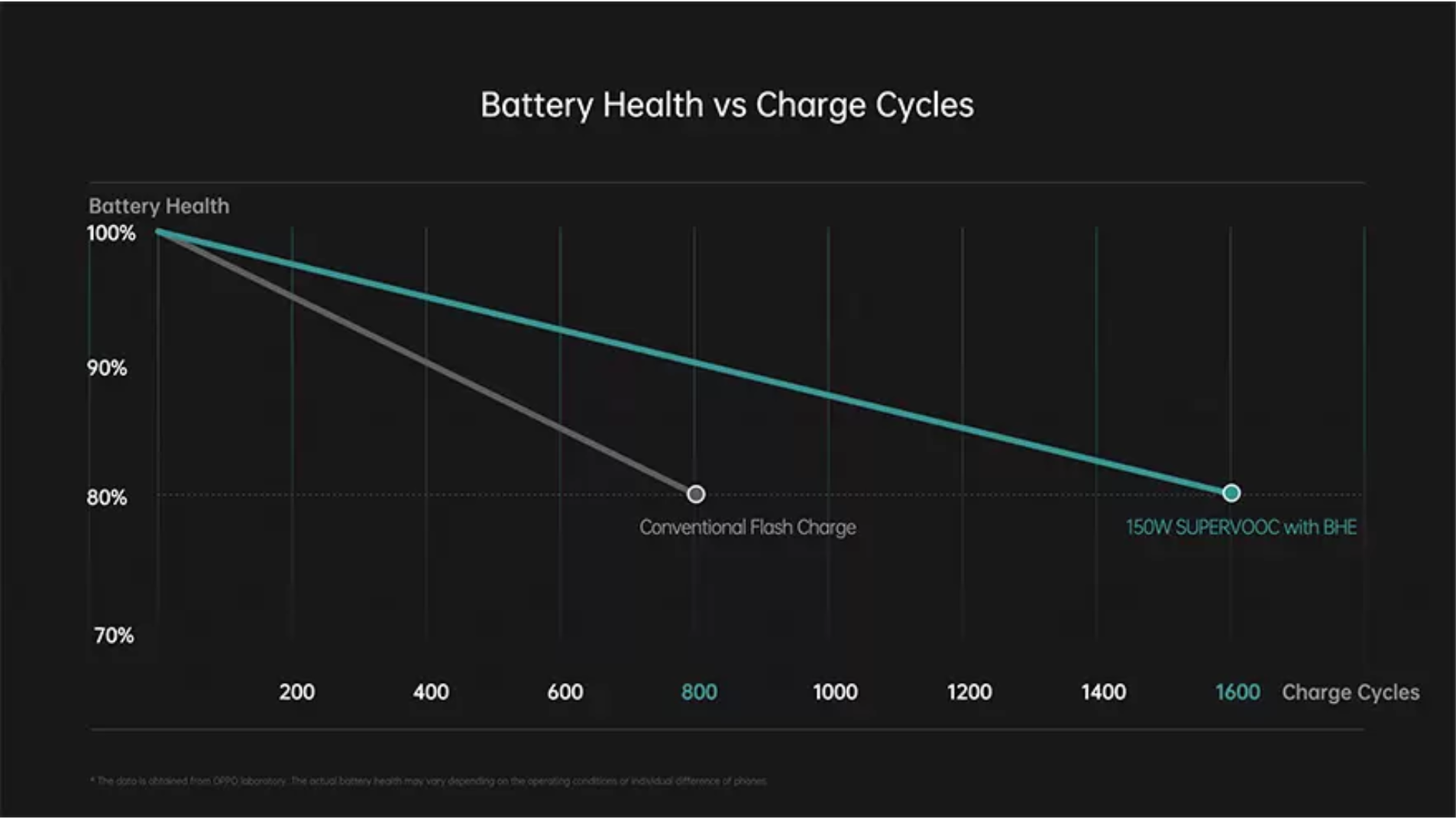 Az okostelefon-iparban az akkumulátor élettartam mértéke a töltési ciklusok száma. A legtöbb piacon lévő telefon 800 töltési ciklus után kb. 80%-ot képes megőrizni az eredeti kapacitásából. Az OPPO új technológiáival 1600 ciklus alatt csökken ennyit az akkumulátorok kapacitása.