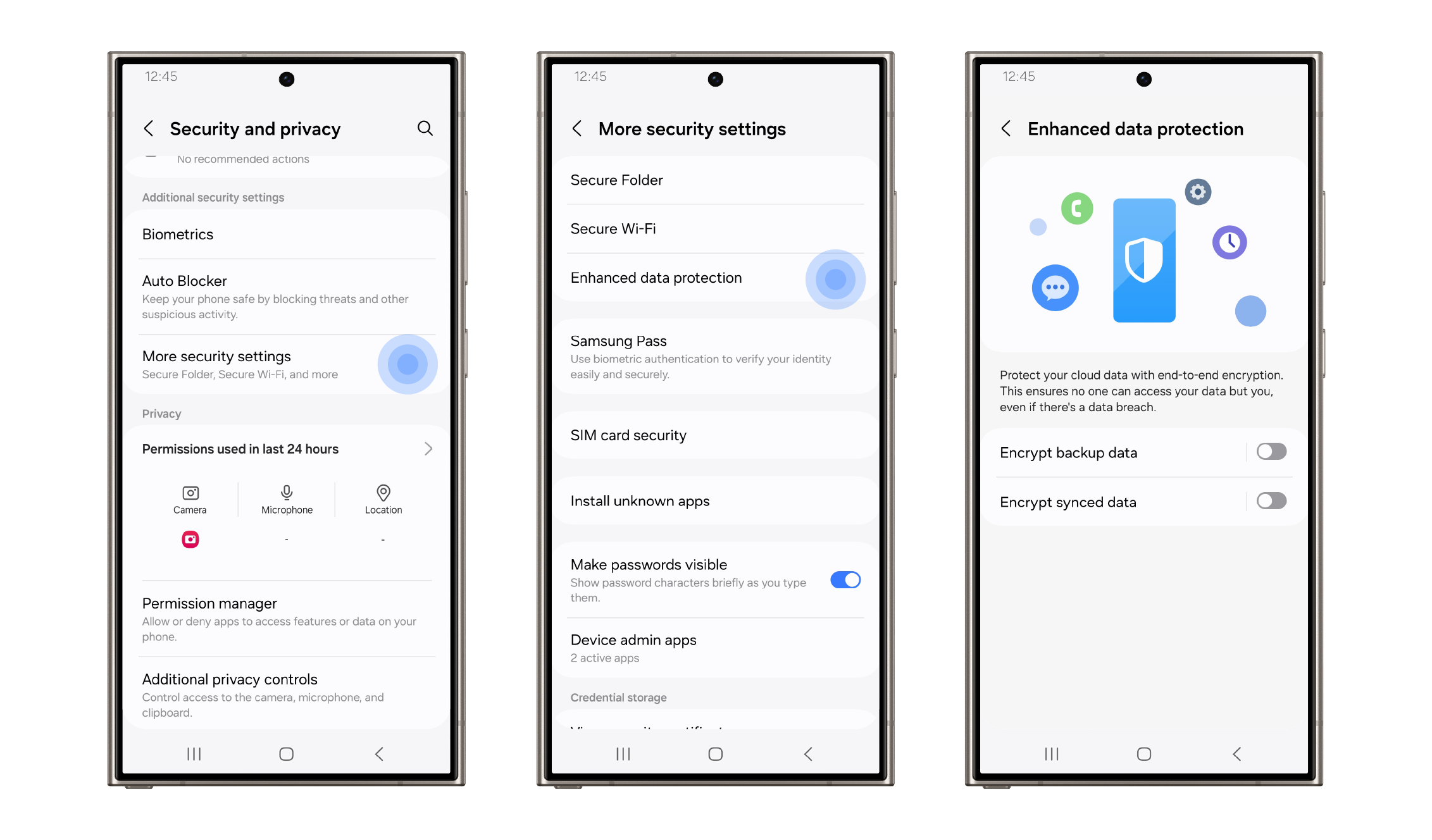 A Galaxy S24 szériával kezdődően a megerősített adatvédelmi funkció további védelmet nyújt a Galaxy készülékek számára, amikor szinkronizáljuk vagy biztonsági másolatot készítünk adatainkról a Samsung Cloud segítségével.2 Ez a funkció az adatvesztést végponttól végpontig tartó titkosítással (E2EE) mérsékli, amely biztosítja, hogy az adatok csak a mi készülékünkön titkosíthatók vagy dekódolhatók, és rajtunk kívül senki más nem láthatja őket. Más szóval, védett körülmények között csatlakozhatunk más eszközökhöz, és adataink akkor is biztonságban lesznek, ha egy szerver veszélybe kerül vagy ellopják a fiókadatokat.